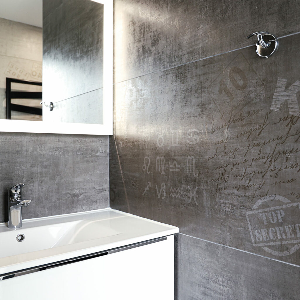 Pose de faïence grise dans une salle de bain.